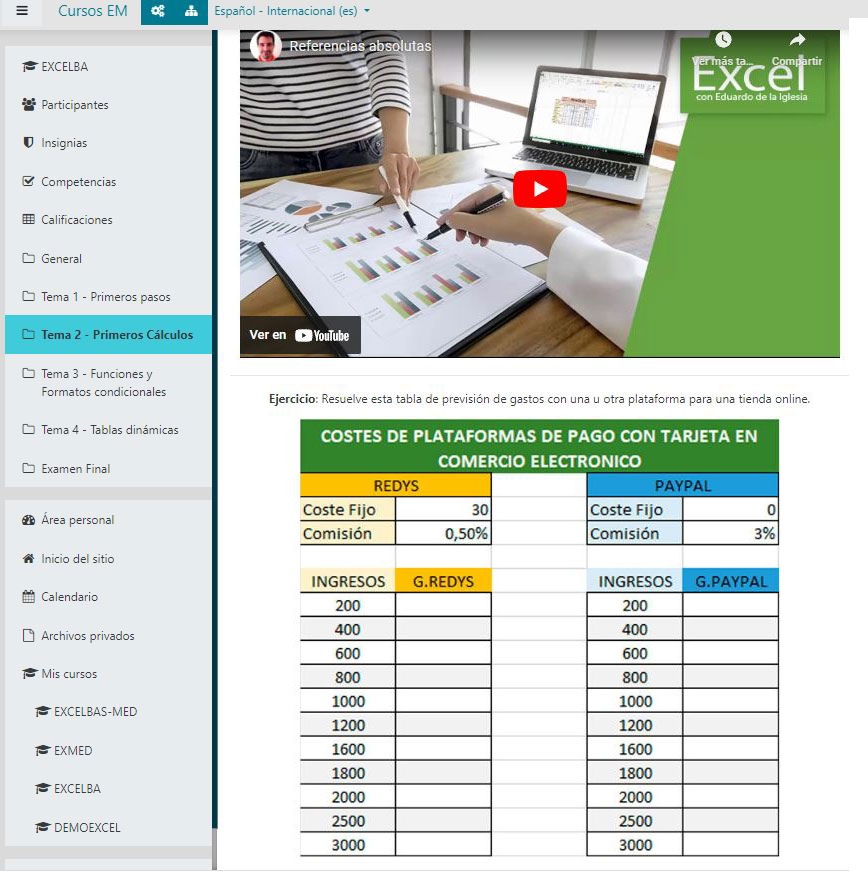 Gran parte del temario del curso de excel lo subiremos a la plataforma online de forma gratuita para que el alumno que se pierda una clase pueda repasar la lección en la que se quedo en el curso de excel online.